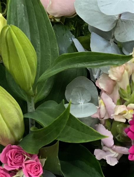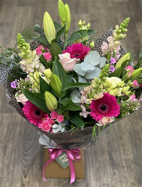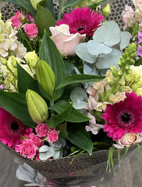 A beautiful selection of seasonal flowers. Including Roses, lilies, gerbera and lisianthus.